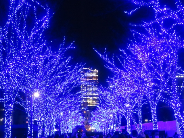 並木道に連なる光は遠くまで続いているように感じられ、まるで青い洞窟の中を進んでいるかのような幻想的な景色には、思わず足を止めて見とれてしまうほどです。