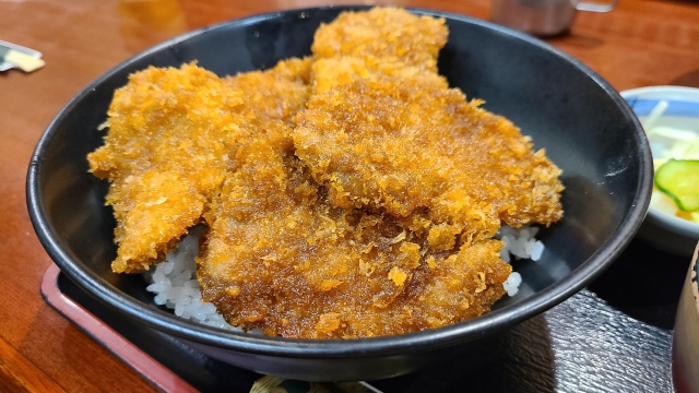 揚げたての薄めのトンカツを甘辛い醤油だれにくぐらせて、ご飯の上に乗せたシンプルなメニューです。
