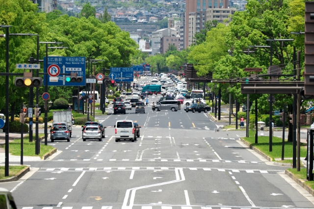 広島市中心部を東西に走る平和大通りは、全長約4キロ、幅約100メートルの広々とした通りで「100メートル道路」とも呼ばれます。