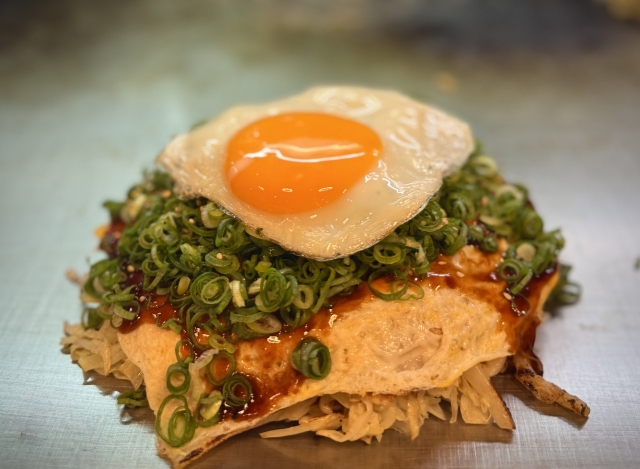 広島県を代表する名物で、薄く焼いた生地にキャベツやもやし、豚肉を重ね、焼きそばやうどんを加える“重ね焼き”が特徴です。
